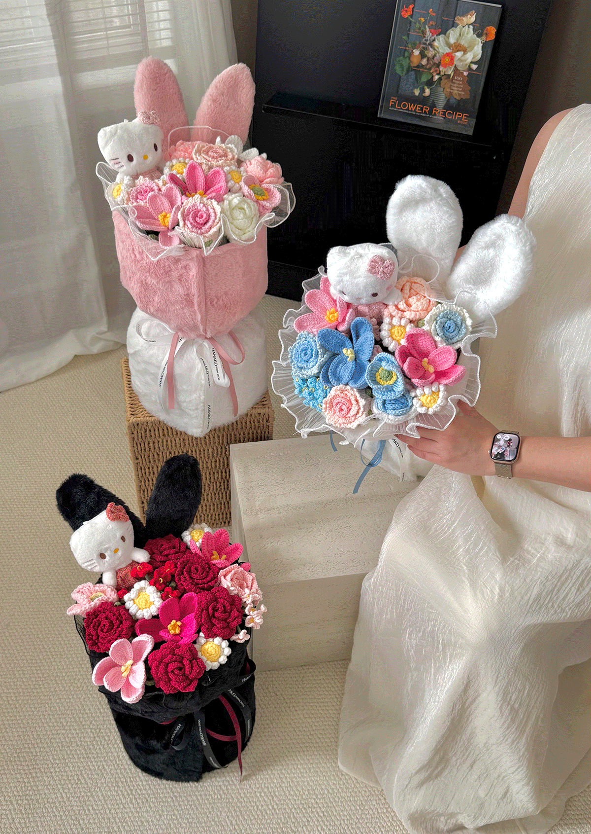 Standing at approximately 42cm tall, 12 crochet flowers, a kitty toy. This bouquet offers a substantial and photogenic presence. Perfect for those who want to gift something meaningful, lasting, and a little different from ordinary bouquets.